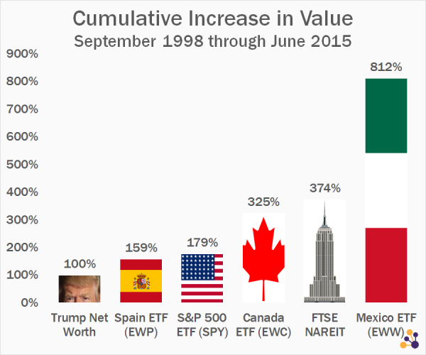 Somewhat ironically, Trump would have been even wiser to put that $5 billion into the MSCI Mexico ETF (EWM). That fund has gained more than 800 percent during the period in which Trump’s wealth doubled. If Trump had invested his “$5 billion” in 1998, it would have grown to more than $40 billion today.
